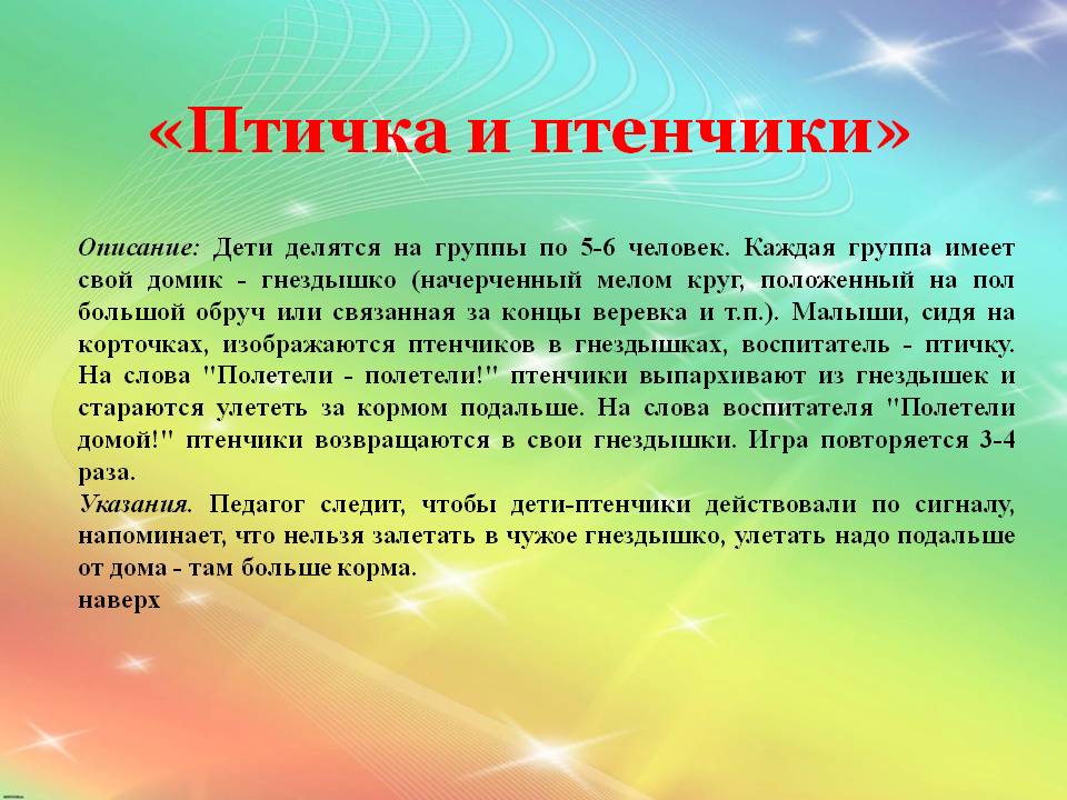 2. Прокатывание мяча «Ловко и быстро» В зале на полу в две параллельные линии выложены набивные мячи (4-5 штук) на расстоянии 50 см один от другого. Дети строятся в две колонны каждого по одному мячу. Прокатывание мяча между набивными мячами, подталкивая его двумя руками, не отпуская далеко от себя. Подвижная игра «Воробышки в гнездышках»