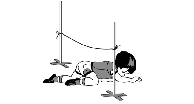 Основные виды движений 1. Прыжки — подскоки на правой и левой ноге попеременно, продвигаясь вперед. 2. Переброска мячей друг другу — стоя в шеренгах, двумя руками от груди (баскетбольный вариант). 3. Лазанье пол шнур прямо и боком.