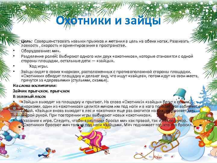 Основные виды движений. 1. Ходьба по наклонной доске. (ширина15 см, высота 30 см), руки в стороны 92-3 раза). 2. Прыжки-перепрыгивание через бруски. (6-8 шт. высотой до 10 см) без паузы (2-3 раза) 3. Забрасывание мячей в корзинку (кольцо) с расстояния 2 м двумя руками из-а головы (5-6 раз). Подвижная игра «Охотники и зайцы»